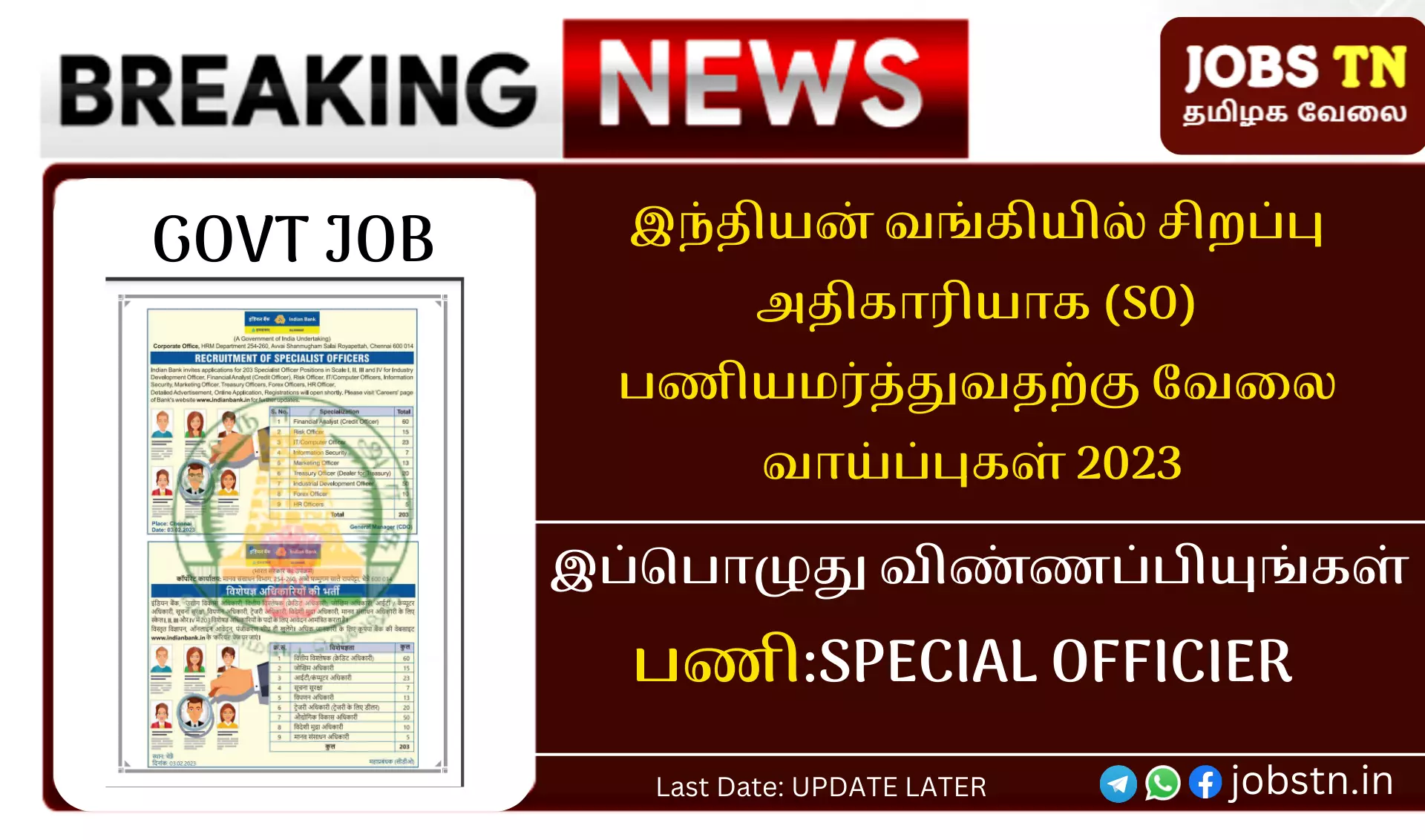 இந்தியன் வங்கியில் சிறப்பு அதிகாரியாக (SO) நியமனம் செய்வதற்கு தகுதியான இந்திய குடிமக்களிடமிருந்து விண்ணப்பங்கள் வரவேற்கப்படுகின்றன.