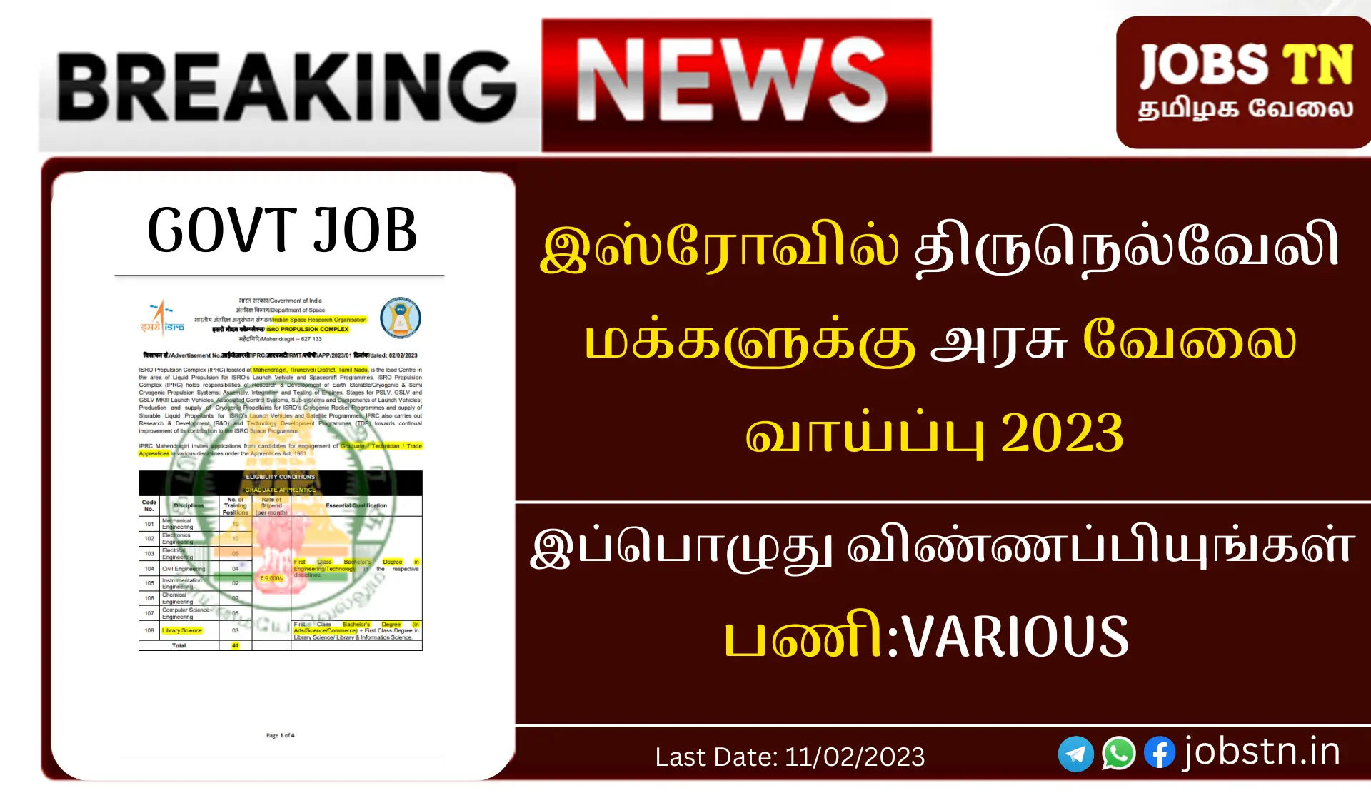 திருநெல்வேலி மக்களுக்கு ஒரு நல்ல செய்தி. இஸ்ரோவில் பணிபுரிய சிறந்த வாய்ப்பு. இஸ்ரோ ப்ராபல்ஷன் வளாகத்தில் பட்டதாரி, தொழில்நுட்ப வல்லுநர், டிரேட் அப்ரெண்டிஸ் பணிகளுக்கு தகுதியான இந்திய குடிமக்களிடமிருந்து விண்ணப்பங்கள் வரவேற்கப்படுகின்றன.