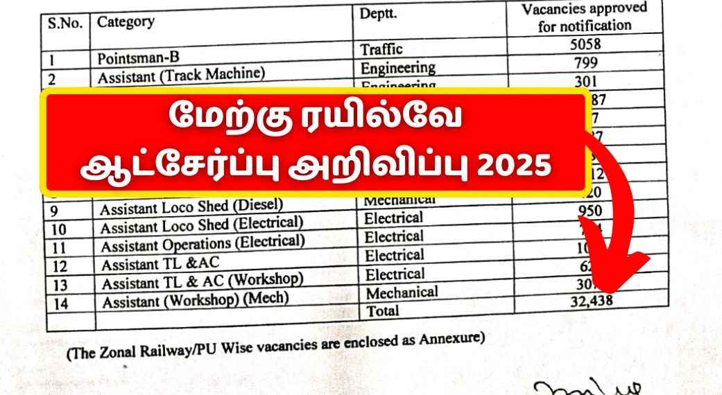 - குறிப்பு: விண்ணப்பங்கள் Railway Board அனுமதித்த பணியிடங்களுக்கே மட்டுப்படுத்தப்படும்.