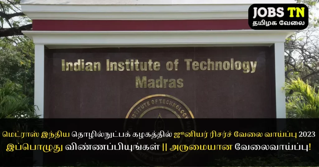 மெட்ராஸ் இந்திய தொழில்நுட்பக் கழகத்தில் ஜூனியர் ரிசர்ச் ஃபெலோ பணியிடங்களுக்கு தகுதியான இந்திய குடிமக்களிடமிருந்து விண்ணப்பங்கள் வரவேற்கப்படுகின்றன.