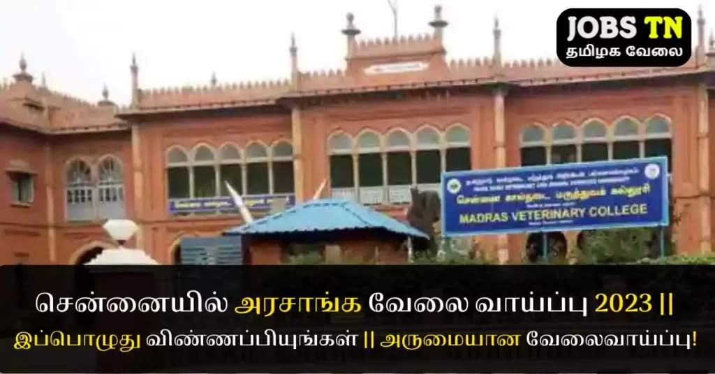 சென்னை மக்களுக்கு ஒரு நற்செய்தி: வெகுநாள் வேலை இல்லாமல் நீங்கள் இருக்கலாம், ஆனால் இப்போது இருக்க வேண்டிய அவசியமில்லை. உங்களுக்காகவே ஒரு அருமையான வேலை வாய்ப்புடன் இந்த பதிவை தொடங்குகிறேன். சென்னை வெட்னரி காலேஜ் இல் பிராஜக்ட் அசோசியேட் இரண்டு மற்றும் லேபர் பணிக்கான விண்ணப்பம் தொடங்கியுள்ளது. இந்த வேலைக்கு விண்ணப்பிக்க விரும்பினால் இப்பொழுது விண்ணப்பியுங்கள்.