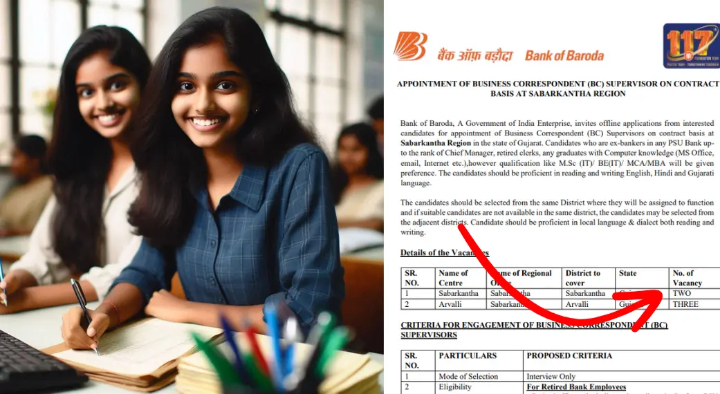 Bank of Baroda, இந்தியாவின் முன்னணி அரசு வங்கி, Sabarkantha Region, Gujarat இல் உள்ள Business Correspondent (BC) Supervisors பணியிடங்களை ஒப்பந்த அடிப்படையில் நிரப்ப அறிவிப்பு வெளியிட்டுள்ளது.
