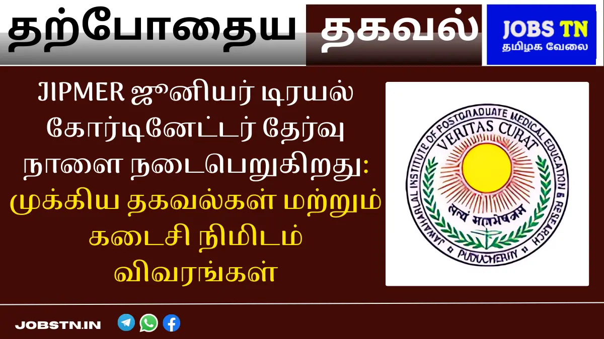 இந்தத் தேர்வு, (JIPMER Junior Trial Coordinator) ஜூனியர் டிரயல் கோர்டினேட்டர் பதவிக்கு தேர்வுக்கான முக்கியக் கட்டமாக இருக்கும். அனைத்து விண்ணப்பதாரர்களும் தயாராகுங்கள், நாளைய தேர்வில் வெற்றிக்கு வாழ்த்துகிறோம்!