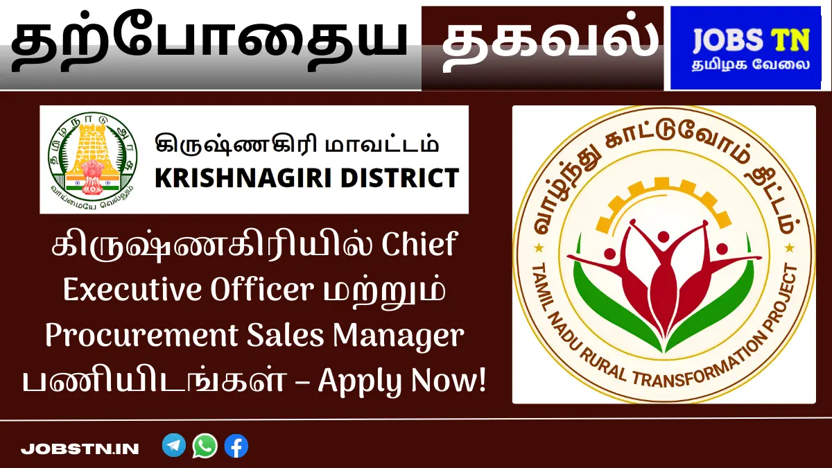 கிருஷ்ணகிரி மாவட்டத்தில் உள்ள (VAAZHNDHU KAATUVOM PROJECT, KRISHNAGIRI DISTRICT) கீழ், தலைமை செயலாளர் (CEO) மற்றும் PROCUREMENT விற்பனை மேலாளர் (PSM) எனும் இரு முக்கிய பணியிடங்களுக்கு விண்ணப்பங்கள் வரவேற்கப்படுகின்றன.