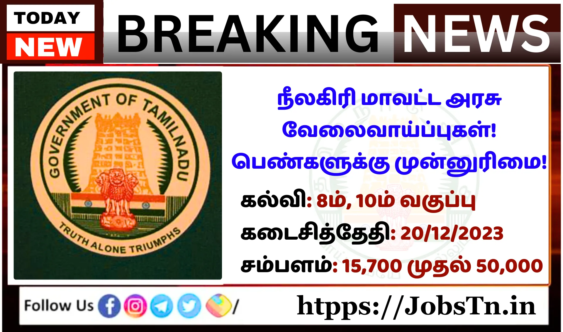 எட்டாம் வகுப்பு தேர்ச்சி பெற்றவர்கள் முதல் விண்ணப்பிக்கக்கூடிய வேலை இதில் அடங்குகின்றது. பெண்களுக்கும் முன்னுரிமை அளிக்கப்பட்டுள்ளது என்பது குறிப்பிடத்தக்கது. எனவே நீலகிரி மாவட்ட பெண்கள் இந்த வேலை வாய்ப்பு பற்றி விவரங்களை தெரிந்து கொண்டு விண்ணப்பிக்க தயாராகுங்கள்.