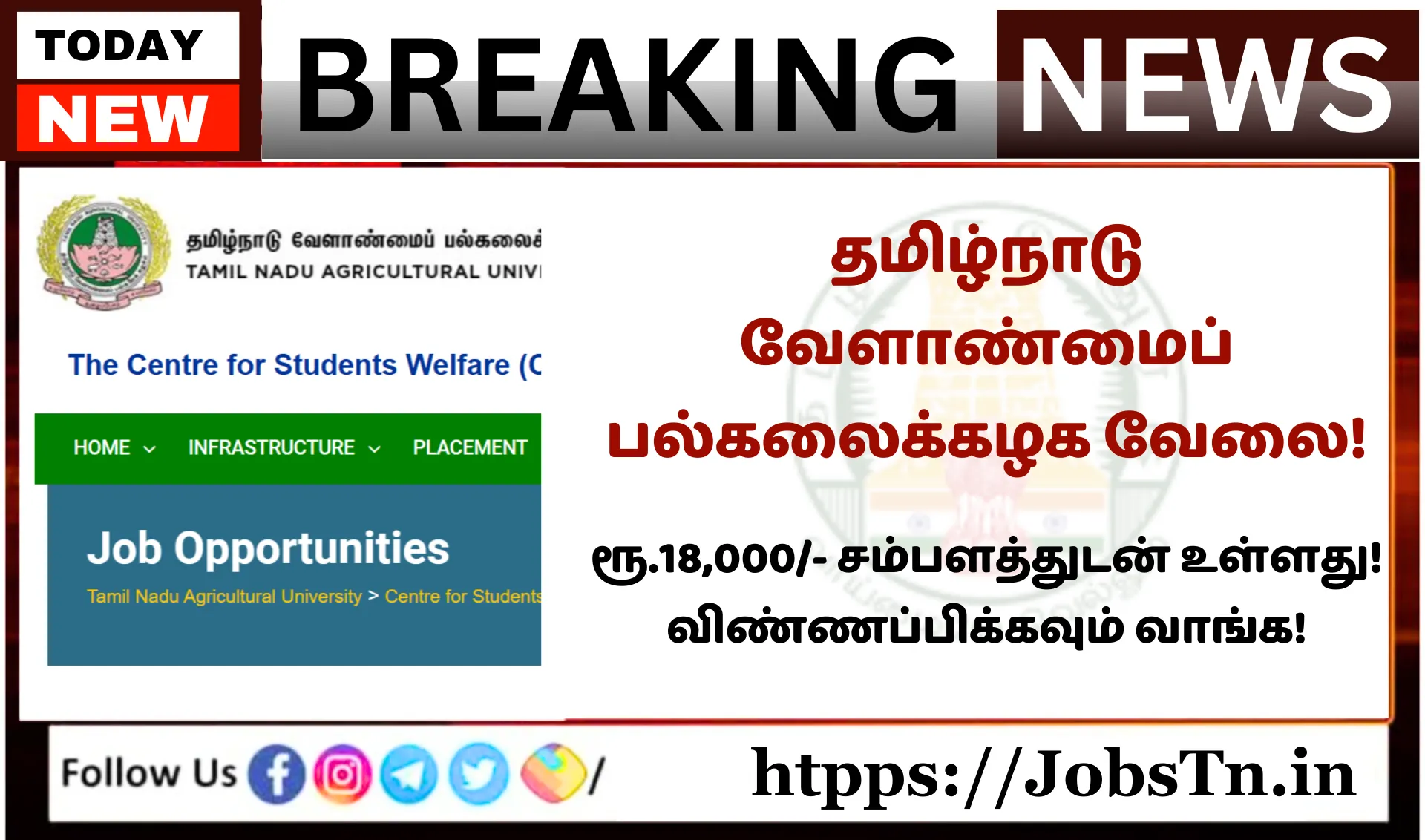 தமிழ்நாடு வேளாண்மைப் பல்கலைக்கழகம் தொழில்நுட்ப உதவியாளர் எனும் 1 பதவிக்கு விண்ணப்பதாரர்கள் விண்ணப்பிக்கலாம்.