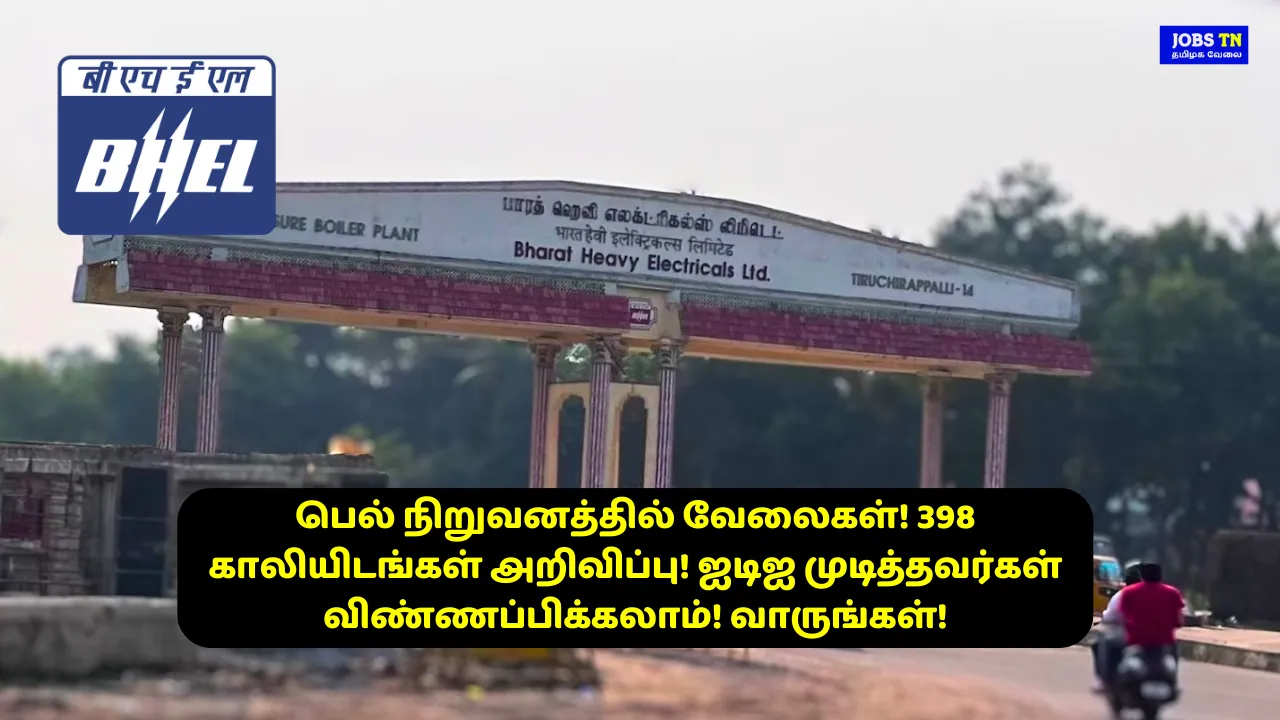 No.TP: HR: R: AA110: பெல் நிறுவனத்தின் பாரத் ஹெவி எலக்ட்ரிக்கல்ஸ் திருச்சியில் இயங்கி வருகிறது. மத்திய அரசின் தேசிய நிறுவனங்களில் ஒன்றான இது, 398 பயிற்சி பணியிடங்களை நிரப்புவதற்கான அறிவிப்பை வெளியிட்டுள்ளது. கல்வித் தகுதி, வயது வரம்பு, சம்பளம் மற்றும் பல போன்ற விவரங்களை நீங்கள் இங்கு முழுமையாக தமிழில் பார்க்கலாம்.