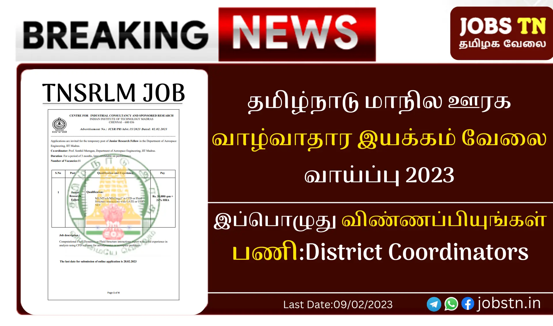 தமிழ்நாடு மாநில ஊரக வாழ்வாதார இயக்கம் திருப்பூரில் மாவட்ட ஒருங்கிணைப்பாளர் பணியிடங்களுக்கு தகுதியான இந்திய குடிமக்களிடமிருந்து விண்ணப்பங்கள் வரவேற்கப்படுகின்றன.